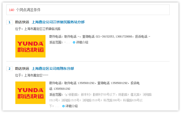 2、查詢結(jié)果頁(yè)面顯示符合條件的快遞公司網(wǎng)點(diǎn)列表,顯示快遞網(wǎng)點(diǎn)所在區(qū)域,公司地址和聯(lián)系電話,如需查看更多信息,點(diǎn)擊 【查看詳情】進(jìn)入網(wǎng)點(diǎn)詳細(xì)頁(yè)面查看。
