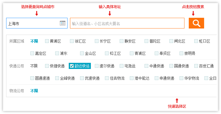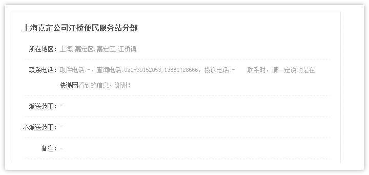 1、進(jìn)入 2、查詢結(jié)果頁(yè)面顯示符合條件的快遞公司網(wǎng)點(diǎn)列表,顯示快遞網(wǎng)點(diǎn)所在區(qū)域,公司地址和聯(lián)系電話,如需查看更多信息,點(diǎn)擊 【查看詳情】進(jìn)入網(wǎng)點(diǎn)詳細(xì)頁(yè)面查看。 3、點(diǎn)擊網(wǎng)點(diǎn)名,即可進(jìn)入網(wǎng)點(diǎn)詳情頁(yè)查看詳細(xì)信息。