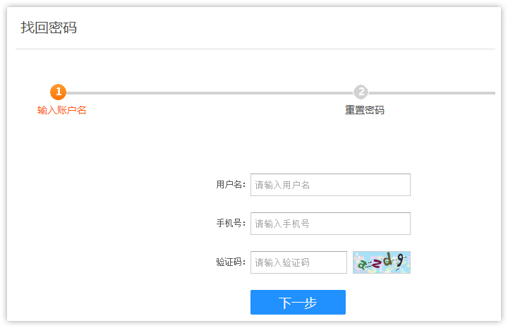 2、進(jìn)入找回密碼頁,填寫您的用戶名和注冊時所用手機(jī)號,進(jìn)入重置密碼頁,即可對您丟失的密碼進(jìn)行重置。