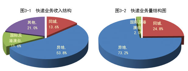 1月,同城、異地、國際及港澳臺快遞業(yè)務(wù)收入分別占全部快遞收入的13.6%、53.8%和11.6%;業(yè)務(wù)量分別占全部快遞業(yè)務(wù)量的24.8%、73.2%和2.0%。與去年同期相比,同城快遞業(yè)務(wù)收入的比重上升0.2個(gè)百分點(diǎn),異地快遞業(yè)務(wù)收入的比重下降2.9個(gè)百分點(diǎn),國際及港澳臺業(yè)務(wù)收入的比重下降了2個(gè)百分點(diǎn)。