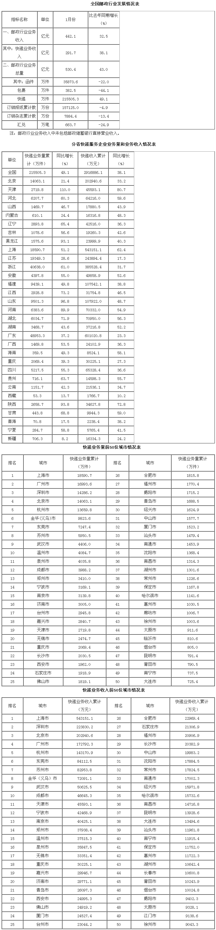 1月,郵政企業(yè)和全國快遞服務(wù)企業(yè)業(yè)務(wù)收入(不包括郵政儲(chǔ)蓄銀行直接營業(yè)收入)完成442.1億元,同比增長32.5%;業(yè)務(wù)總量完成530.4億元,同比增長43%。