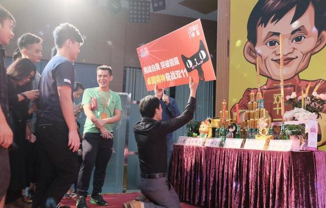 11月10日晚,當(dāng)網(wǎng)友好奇觀看橫空出世的“雙11”晚會時,在廣州市番禺區(qū)電子商業(yè)園區(qū),電商們正在舉辦雙十一加油大會,擺供品、請按摩師為員工們按摩……然后,延續(xù)去年的傳統(tǒng)——排隊拜馬云。與時俱進(jìn)的是,今年畫像上還增加了一個人,剛剛迎娶奶茶妹妹的京東創(chuàng)始人劉強(qiáng)東。