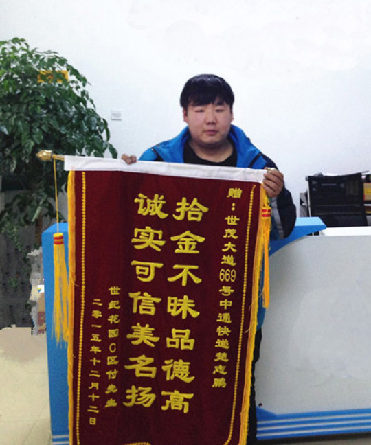 12月20日,一面寫有“拾金不昧品德高 誠實(shí)可信美名揚(yáng)”字樣的錦旗被送到了中通快遞哈爾濱江北大學(xué)分部,失主對該分部快遞員楚志鵬無償歸還丟失錢物的行為再三表示感謝。