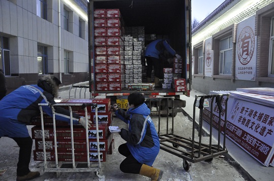 查干湖冬捕,即查干湖冬季冰雪漁獵,是一種極其傳統(tǒng)的漁業(yè)生產(chǎn)方式,始于史前、盛于遼金,延續(xù)至今千年未變,當?shù)貪O民被稱為“最后的漁獵部落”。12月末到春節(jié)前是查干湖冬捕的黃金時間,漁民借助馬拉絞盤的力量在冰下行網(wǎng)捕魚,其盛大的場景每年都吸引著數(shù)萬國內(nèi)外游客前來觀看。2011年,中通吉林松原公司開通了查干湖承包區(qū),推出了“大美查干湖、中通鮮到家”的宣傳口號,并自行購置加厚紙箱、保溫箱等專業(yè)包裝材料,為寄遞客戶提供免費包裝服務(wù)。如今,查干湖分部承包區(qū)日發(fā)件量500票以上,名列松原公司首位,也為查干湖魚的對外銷售打開了一條新通道。